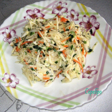 Вариантов этого салата много,состоит он из простых и доступных продуктов.Я бы сказала витаминный салат,который можно использовать как овощной гарнир.Это мой вариант.