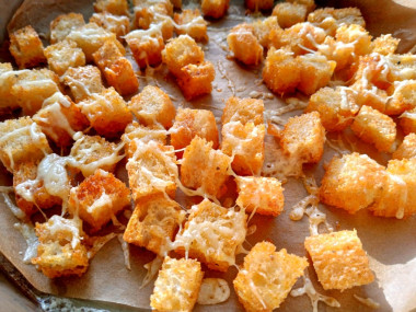 Верните противень в духовку, температуру прибавьте до 220°С. Держите сухарики еще 5-10 минут до расплавления сыра. Точное время будет зависеть от особенностей вашей духовки. Готовые сухарики выньте из духовки и остудите.