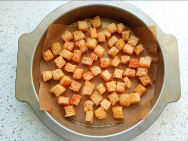 Возьмите противень и застелите его бумагой для выпечки. Выложите на нее сухарики ровным слоем в один ряд. Посыпьте их сверху солью по вкусу. Поставьте противень в духовку, предварительно разогретую до 170°С, на 15-20 минут, пока сухарики не зарумянятся и не затвердеют. Время от времени перемешивайте их.