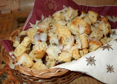 По прошествии времени выньте противень из духовки и посыпьте сухарики тонким слоем сыра.