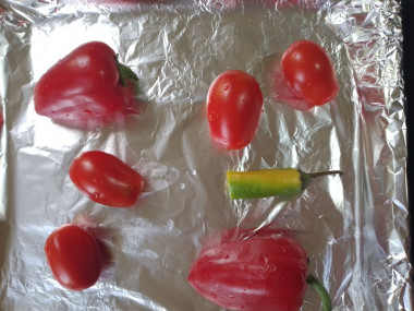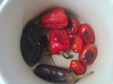 Достаньте форму с овощами из духовки и переложите их горячими в полиэтиленовый пакет. Конец пакета заверните. Оставьте овощи полежать в таком состоянии 7-10 минут. После такой процедуры с них будет очень легко снять кожицу.
