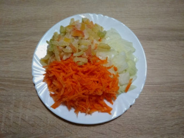 На сковороде разогрейте растительное масло и на среднем огне обжарьте в течение 2-3 минут лук и морковь. Немного остудите зажарку.