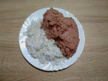 В миске подходящего размера смешайте фарш с отварным рисом. Посолите по вкусу.