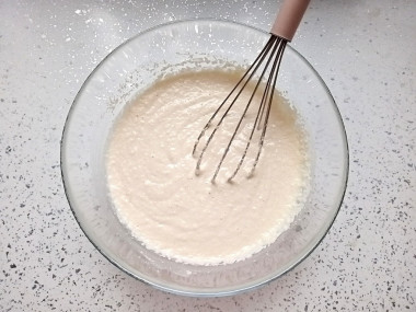 Затем всыпьте разрыхлитель, сахар и еще раз все взбейте до его растворения. Это произойдет довольно быстро, так как продукты были теплыми.