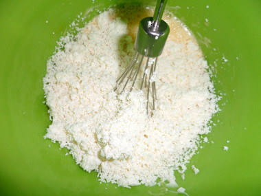 Затем всыпьте в тесто просеянную муку высшего сорта. Добавьте соду и щепотку ванилина. Сначала перемешайте венчиком, чтобы мука вошла в жидкое тесто. Затем включите миксер и перемешайте все до однородного состояния. Возможно муки понадобится чуть меньше или больше, ориентируйтесь на консистенцию теста.