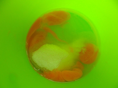 Для приготовления теста возьмите удобную, глубокую чашу, чтобы при замешивании не летели брызги. В подготовленной чаше соедините яйца с сахаром. Немного взболтайте их венчиком, чтобы при взбивании сахар не начал разлетаться в разные стороны. Яйца предварительно вымойте с содой, чтобы убрать с них вредные бактерии.