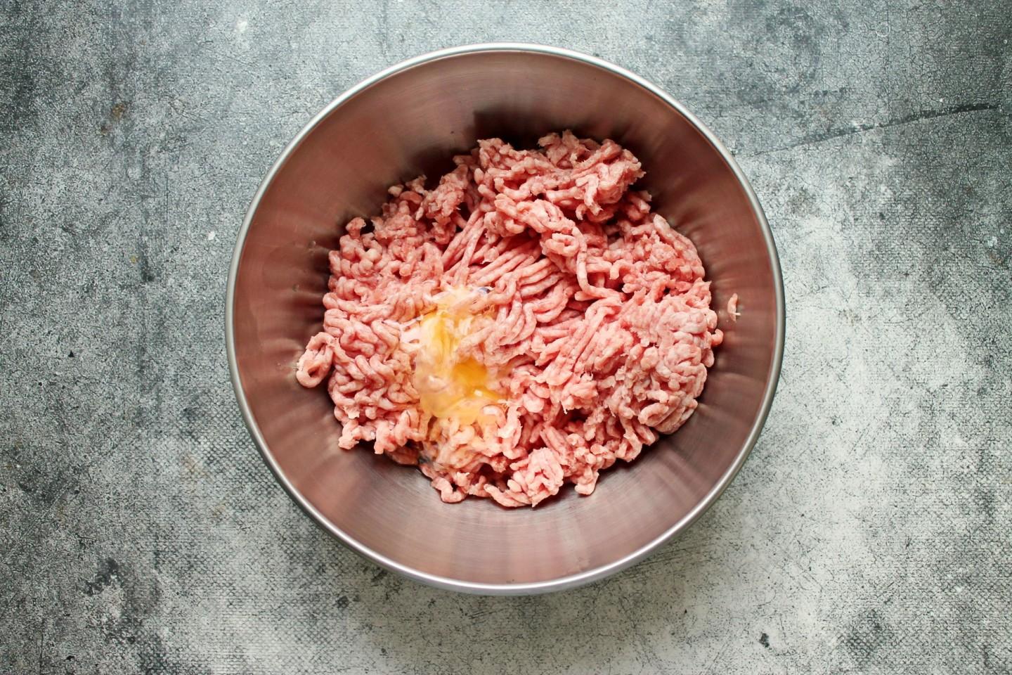 Мясной фарш положите в миску и вбейте яйцо. Обязательно вымойте яйцо, ведь даже при видимой чистоте, на нем могут остаться частички микрогрязи и бактерии.