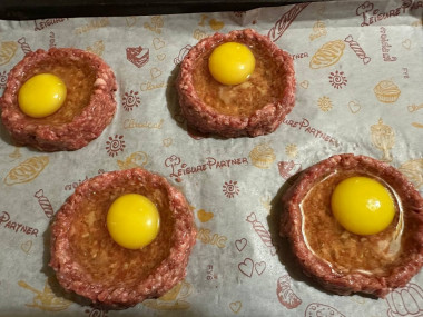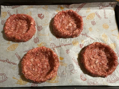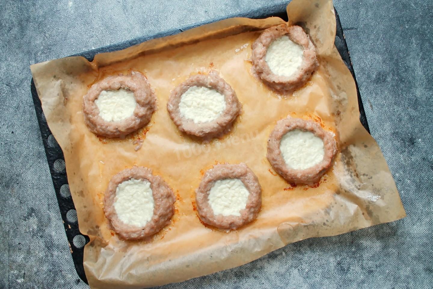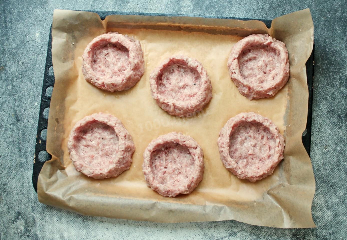 Противень застелите пергаментом и при необходимости смажьте растительным маслом. А все секреты о пергаменте и бумаге для выпечки узнаете под рецептом. Разделите фарш на равные части, у меня их шесть. Сформируйте из них плотные шарики и уложите на пергамент на расстоянии. Смачивая пальцы водой, сформируйте в середине углубление и раздвиньте фарш, формируя пространство.