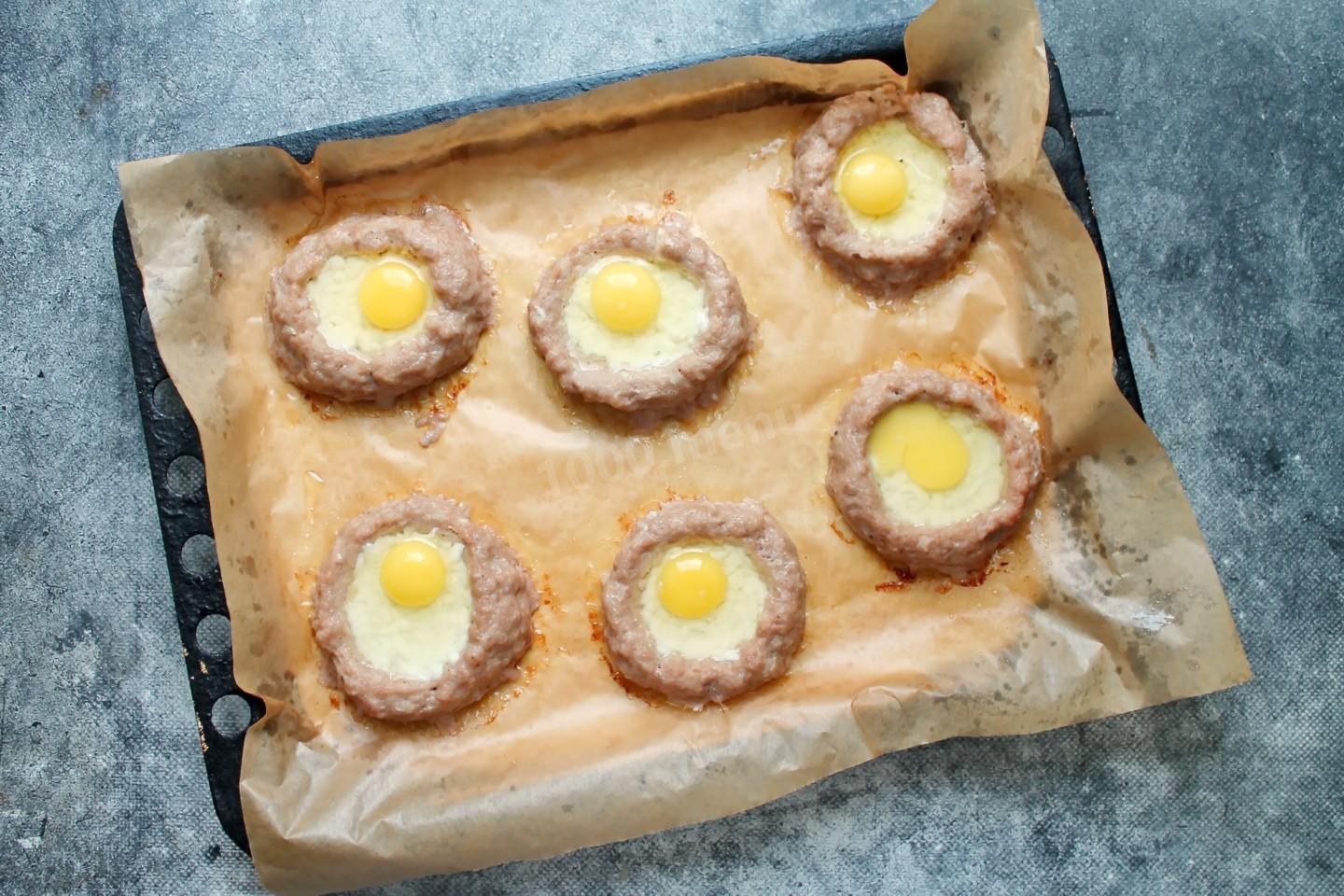 В каждую ватрушку аккуратно вылейте по одному перепелиному яйцу. Если таких нет, можно просто 2-3 куриных яйца перемешать вилкой и заполнить оставшееся углубления в ватрушках. Сколько понадобится яиц, чем они отличаются, поможет статья ниже под рецептом. Верните противень в духовку и запекайте еще 5-8 минут, до желаемого желтка яиц. Но учтите, что при полном запечение, желток получится белым из-за тонкого слоя белка на поверхности.
