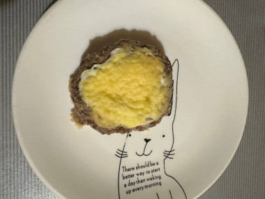 Противень с ватрушками поставьте в разогретую до 180 градусов духовку и запекайте примерно 20 минут. Достаньте и уберите из углубления сок, если он появился. Смажьте им верх и внешние бока ватрушек. Сыр, у меня моцарелла, натрите на средней терке и разделите на шесть частей. Положите сыр внутрь ватрушки и прижмите, он все равно осядет. Подойдет любой сыр, который хорошо плавится, а как заменить один вид сыра на другой можно найти в статье под рецептом.