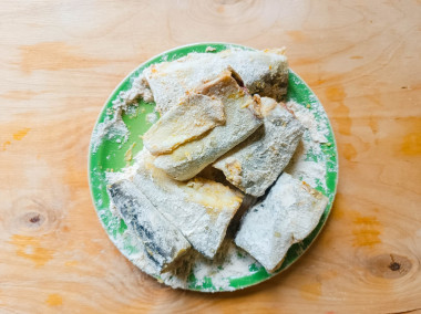Смешать куркуму с черным перцем и солью, потом обсыпать этим рыбу. Обвалять рыбные кусочки в муке и перед тем как положить их в мультиварку, разогреть ее в режиме «выпечка» под закрытой крышкой, не забыв добавить растительное масло.