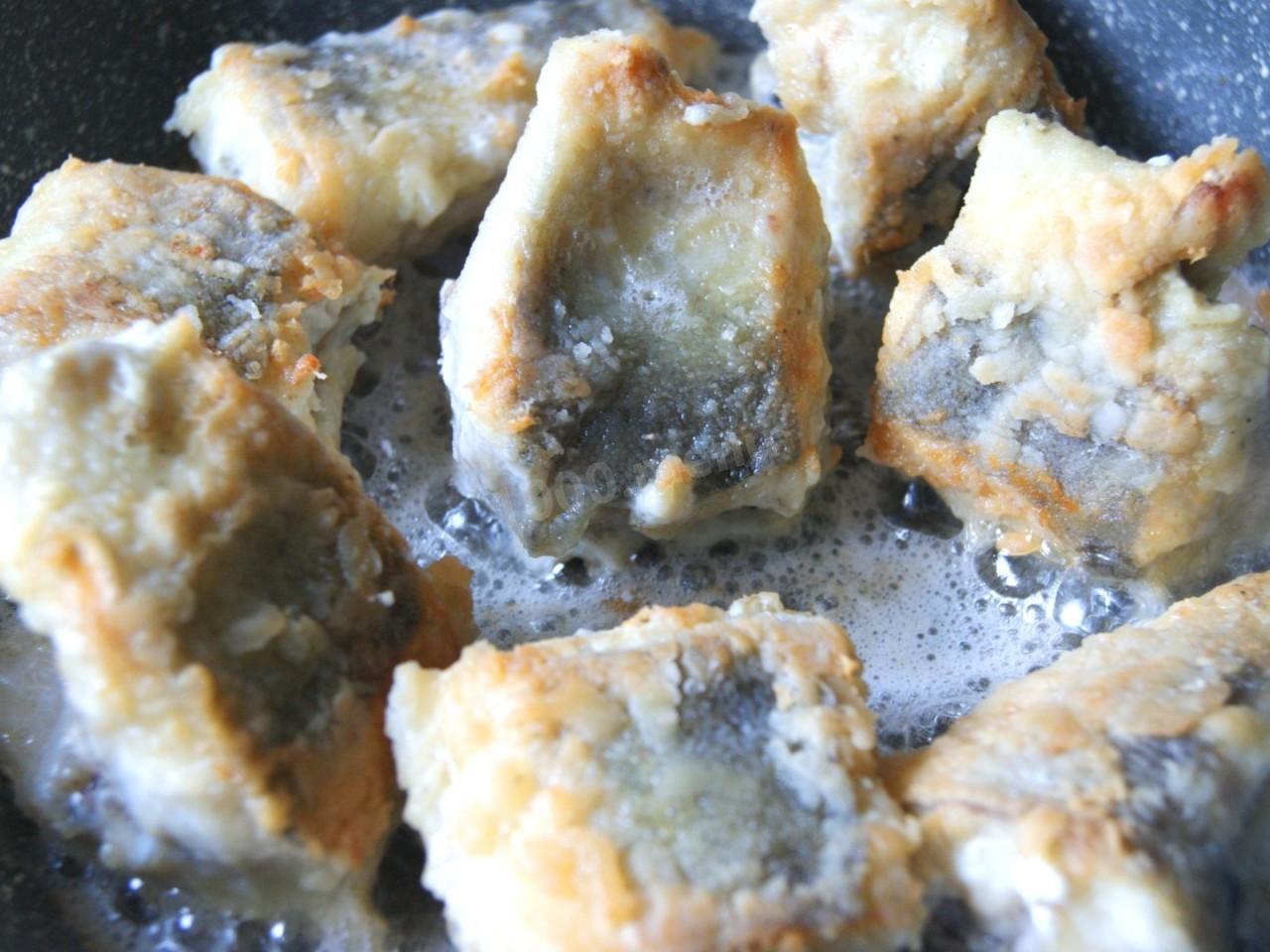 Обмокните кусочки рыбы с всех сторон сначала во взбитых яйцах