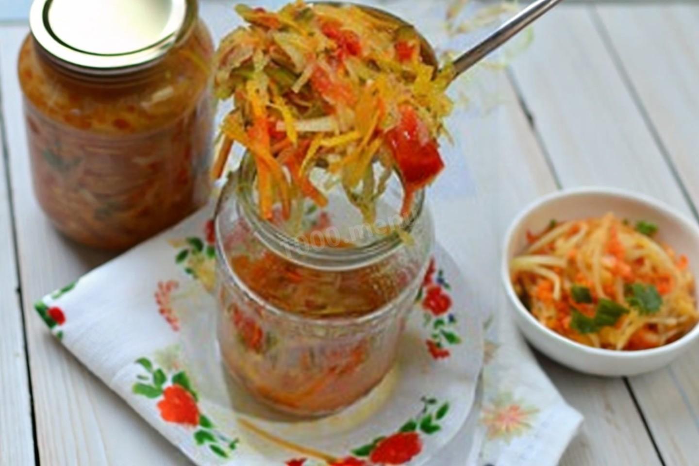 Соедините все овощи в глубокой посуде и перемешайте, тушите около 20 минут на слабом огне. Чтобы выпарилась лишняя жидкость, снимите крышку. Рекомендации по выбору кастрюли для тушения вы найдёте в статье ниже рецепта. Затем добавьте сахар, соль. Влейте растительное масло. Держите на огне ещё 5 минут, постоянно помешивая. Влейте уксус, тщательно перемешайте и тушите ещё 5 минут.