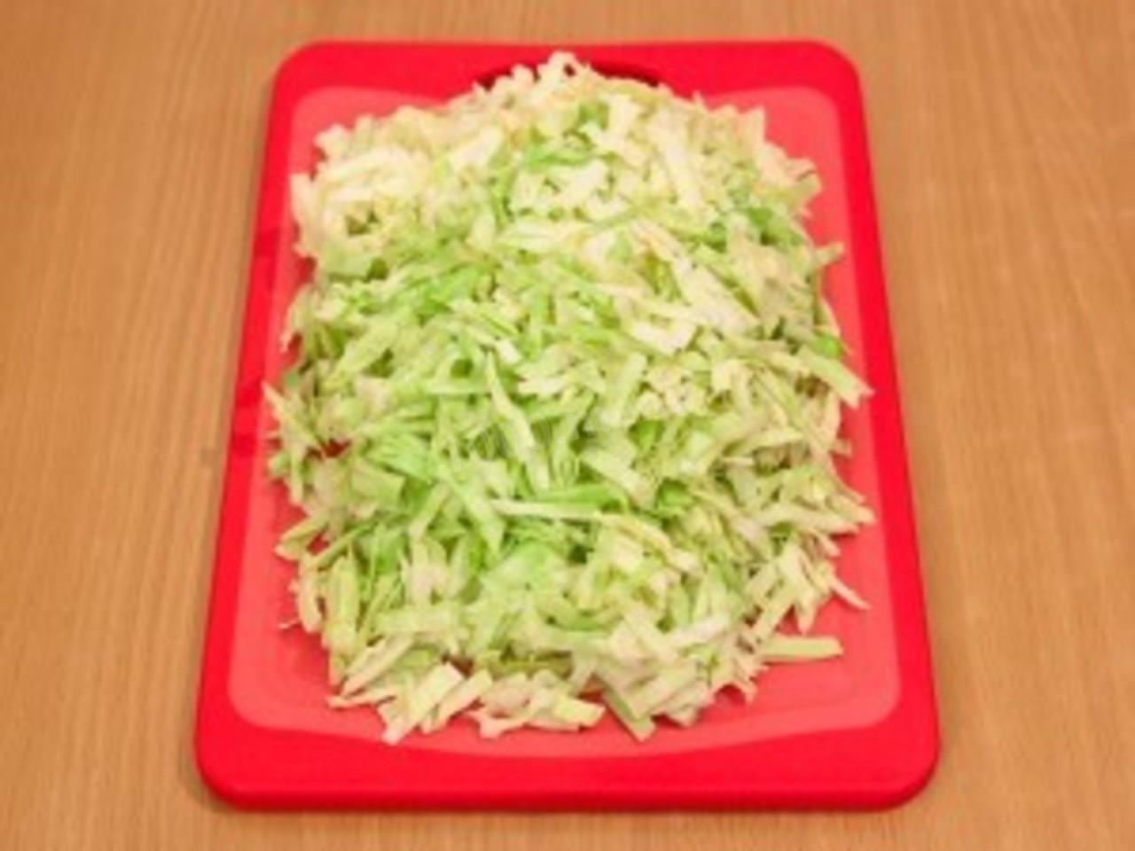Подготовьте продукты. Все овощи промойте под холодной проточной водой и обсушите бумажными полотенцами. Выбирайте плотные, сочные кочаны капусты без вялых листьев. Перед нарезкой удалите верхние листья и кочерыжку. Нарежьте капусту мелкой соломкой. Если хотите более нежную текстуру, можно слегка помять нарезанную капусту руками.