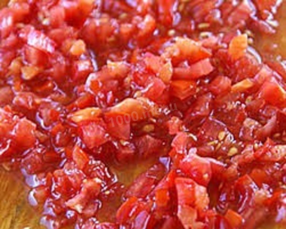 Помидоры выбирайте сочные, но плотные, удалите у них плодоножки и нарежьте кубиками толщиной около 0,5 см. Мягкие плоды плохо держат форму, в процессе нарезки и приготовления они могут превратиться в бесформенную массу и испортить внешний вид блюда.
