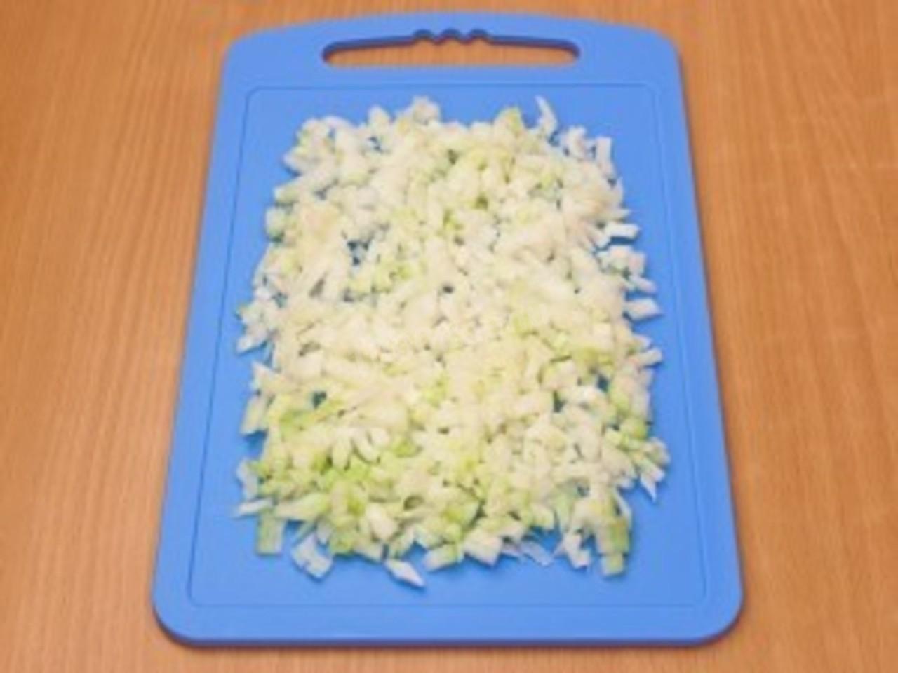 Чтобы при нарезке лука не раздражалась слизистая глаз, промойте луковицу и нож холодной водой. Разделочная доска не впитает неприятный луковый запах, если перед нарезкой натереть ее кусочком лимона. Нарежьте лук мелкими кубиками: разрежьте луковицу пополам, сделайте продольные надрезы, не доходя до корня, затем нашинкуйте поперек. Зелень (петрушку, укроп) добавляйте по вкусу: промойте, обсушите бумажными полотенцами и мелко нашинкуйте.
