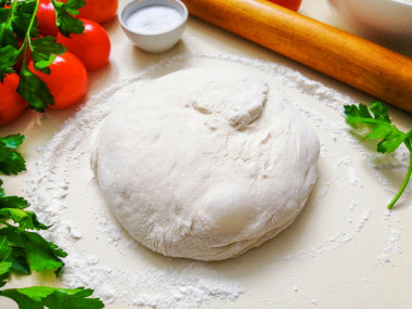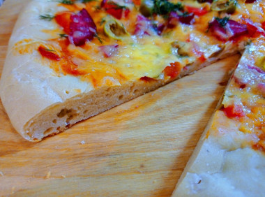 Тесто отлично подошло. Оно достаточно липкое, но смазывание рук и противня растительным маслом решает эту проблему. Тесто очень эластичное и не рвется. Растянуть его в тонкий пласт для основы пиццы не составляет никакого труда. Запекала пиццу при 190 градусах в течение 15 минут.
