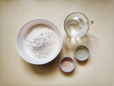 Для приготовления теста подготовьте необходимые ингредиенты по списку. Воду нагрейте до теплого состояния, примерно, 35 градусов. Муку просейте пару раз через сито, чтобы насытить её кислородом. Дрожжи будем использовать сухие, которые можно добавлять сразу в муку. Масло можно использовать как оливковое, так и растительное.