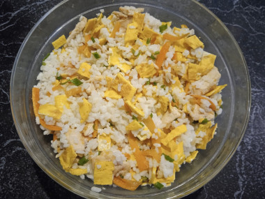Блюдо вроде и простое, но настолько необычное. Сочетание овощей, риса, курицы, яиц с соевым соусом мега вкусное. Восточное блюдо вышло аппетитным, сытным и совершенно неожиданным. Вкусовые качества выше всяких похвал. Шикарное блюдо с красивым названием. Рецепт очень и очень хороший. Всем советую попробовать! Автору большое спасибо!