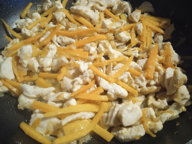 Лук и перец нарезать на кубики, шампиньоны порезать ломтиками и добавить ростки сои. Куриное филе нарезать кубиками. На разогретой сковороде обжарить курицу на растительном масле. Добавить к курице нарезанные овощи, обжаривать около двух минут, периодически помешивая.