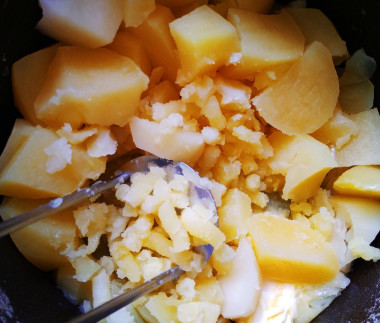 С помощью толкушки помните картофель в пюре. На горячем картофеле сливочное масло сразу будет таять и пропитывать его своим вкусом и ароматом.
