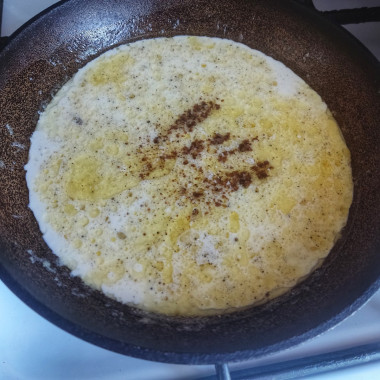 Теперь возьмите сковороду с толстым дном (она должна быть сухой и нежирной, поэтому перед использованием нужно хорошенько вымыть ее) и положите в нее кусочек сливочного масла и мелко нарезанный чеснок. Включите небольшой огонь и обжаривайте продукты, постоянно перемешивая их и доведя чеснок до мягкости, не допуская его зарумянивания – он должен стать почти прозрачным. С выбором сковороды поможет статья по ссылке в конце рецепта.