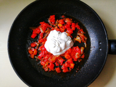 Чтобы использовать весь соус сразу свежеприготовленным, сделала его немного. Лук нарезала полукольцами, обжарила на растительном масле. Затем добавила к нему нарезанный кубиками помидор. Кожицу с него снимать не стала, раньше делала так же, готовя блюда с помидорами, кожица в них не ощущалась.