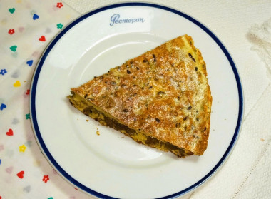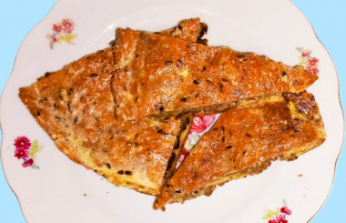 На сковороду или в невысокую жаропрочную форму выкладываем половину теста, выкладываем начинку и сверху выкладываем вторую половину теста. Выпекаем в духовом шкафу при температуре 170-180 градусов 35-40 минут.