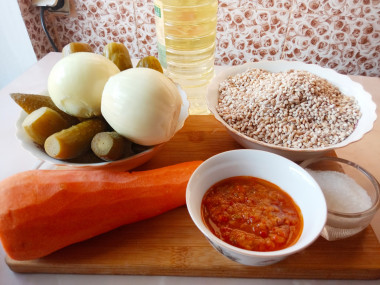Калорийность продуктов: Перловка, Соленые огурцы, Морковь, Лук, Растительное масло, Лавровый лист, Душистый перец, Вода, Томатная паста, Сахар, Соль, Рассол