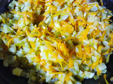 Морковь вымойте со щёткой под проточной водой и очистите с помощью овощечистки. Натрите овощ на крупной терке. Репчатый лук очистите от шелухи и нарежьте мелкими кубиками. Для приготовления основы для рассольника я выбрала очень глубокую сковороду с антипригарным покрытием. Ещё можно использовать кастрюлю. Сковороду разогрейте на сильном огне, влейте растительное масло. Огонь уменьшите до среднего и обжарьте лук и морковь до золотистого цвета.