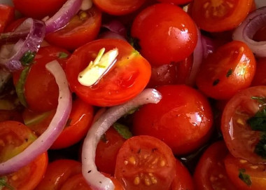 Как сделать помидоры дольками с луком и маслом на зиму? Приготовьте ингредиенты. Нужно использовать плотные помидоры, небольшого размера с толстой кожицей. Нам нужны такие специи и зелень: лавровый лист, перец душистый, гвоздику, веточку петрушки, укропа и хрен для аромата и пикантности вкуса. По желанию можно добавить еще какую-либо приправу. Зелень тщательно промойте, дайте ей просохнуть, откинув на дуршлаг.