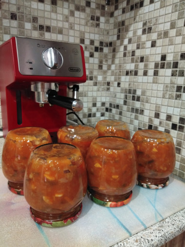 Банки хорошо промойте и простерелизуйте удобным для Вас способом. Я обычно делаю это в духовке. Поместите банки и крышки в холодную духовку, установите нагрев на 180 градусов и поставьте таймер на 20 минут. Заполните стерильные банки горячим соте, закатайте стерильными крышками. Из данного количества ингридиентов у меня получилась одна банка объёмом один литр и маленькая баночка объемом 0,3 мл.