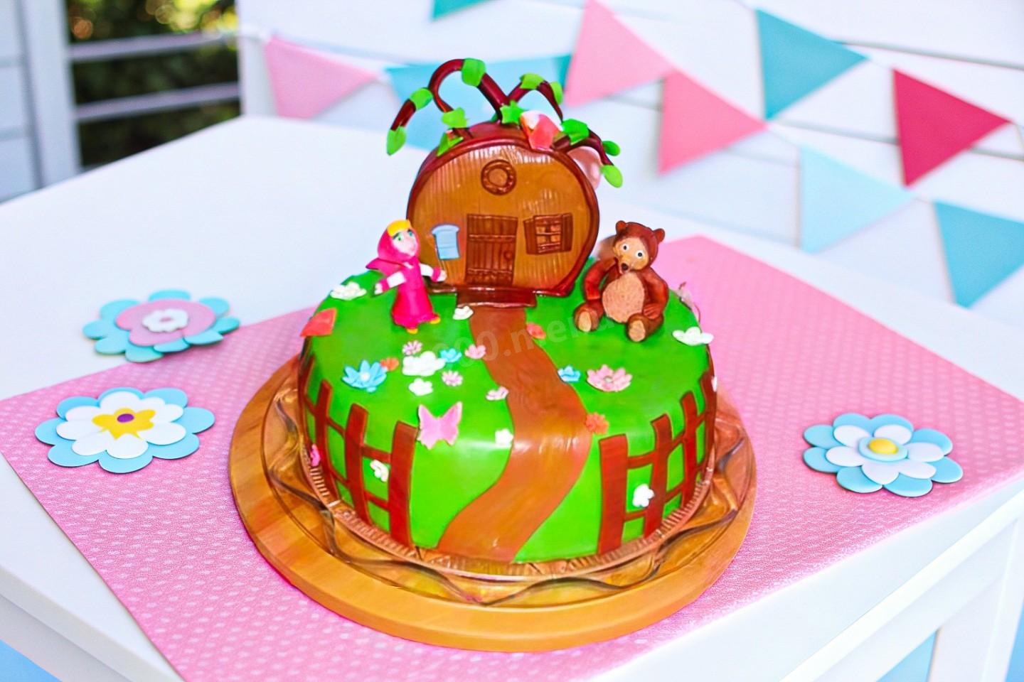 Приклеить на торт изготовленные заранее фигурки главных героев - Маши и Медведя. А также цветочки, листики и бабочек. Дать торту немного подсохнуть.