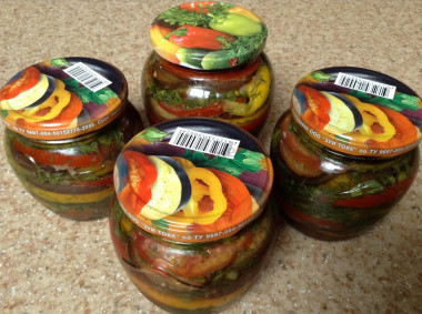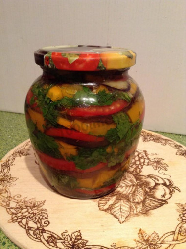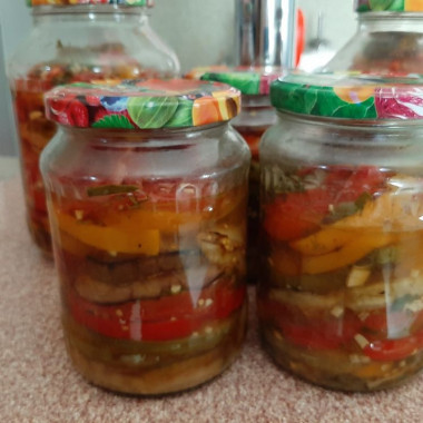 Выложите овощи слоями в произвольном порядке. Каждый слой слегка утрамбовывайте. До самой крышки накладывать не нужно, так как при дальнейшей стерилизации, овощи могут вытолкнуть ее. Масло доведите до кипения и залейте аккуратно в баночки.