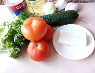 Приготовила овощной салат с брынзой и помидорами. Салатного лука у меня не было, использовала репчатый, ошпарила его кипятком и сразу же облила холодной водой, так лук становится менее резким, но сохраняет аппетитный хруст. Всё ингредиенты нарезала, листья салата порвала руками, брынзу натерла на крупной тёрке. Салат получается очень вкусный, сочный. Добавление брынзы и консервированного горошка делает его ещё и достаточно сытным. Мне очень понравилось такое сочетание продуктов. Спасибо за рецепт, Жемчужинка!