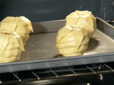 Запекайте яблоки в слоеном тесте в духовке, предварительно разогретой до 200°С, 15-20 минут, до золотистого цвета. Точное время будет зависеть от особенностей вашей духовки. Готовые яблоки выньте из духовки.