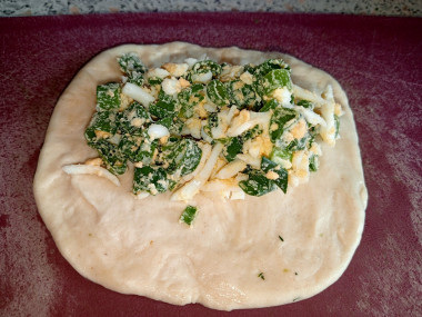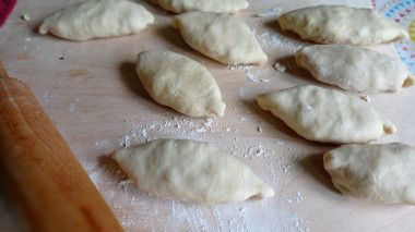 Тесто нарежьте на кусочки. Количество кусочков зависит от того, какого размера вы хотите получить пирожки. У меня вышло 16 пирожков. Каждый кусочек теста немного раскатайте или разомните руками. В центр выложите немного луковой начинки, защипите края и сформируйте пирожок.