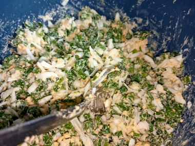 Остывшие яйца очистите от скорлупы и мелко нарежьте. Добавьте яйца к луку и все хорошо перемешайте до однородного состояния.