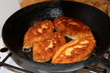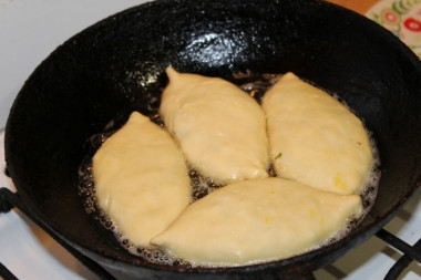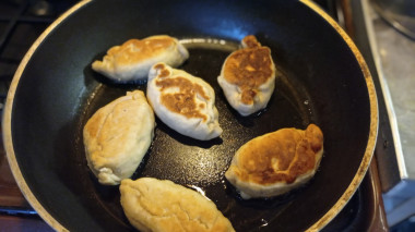 Сковороду для жарки разогрейте до горячего состояния и налейте немного растительного масла. Выложите подготовленные пирожки и обжаривайте их на небольшом огне по 2-3 минуты с каждой стороны. Как выбрать сковороду и масло для жарки читайте в статьях на эти темы, ссылки внизу рецепта.