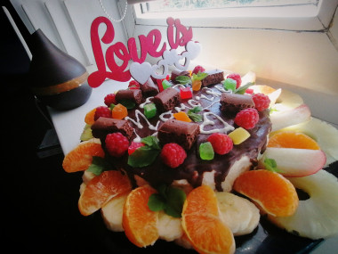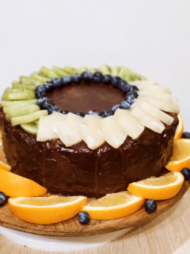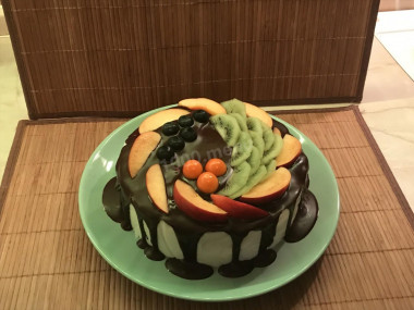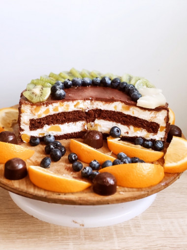 Думаю, в зависимости от сезона фрукты можно подбирать по вкусу. К примеру, зимой можно использовать всевозможный консервированные фрукты или взять киви, бананы, хурму, а вот летом, кроме фруктов, можно смело взять всевозможные ягоды, благодаря которым торт будет еще и очень ярким на вид.