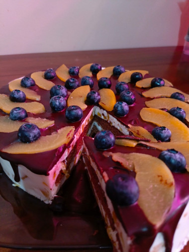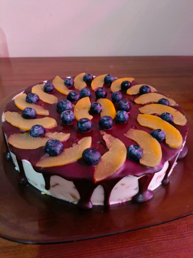 Перед самой подачей украсьте торт фруктами и при желании ягодами. Я для украшения использовала персики, нектарин, малину и ежевику. Украшайте по своему вкусу. Я выложила фрукты и ягоды по краю, а центр оставила нетронутым.