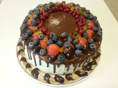 Торт с шоколадными подтеками и фруктами готов к подаче.
