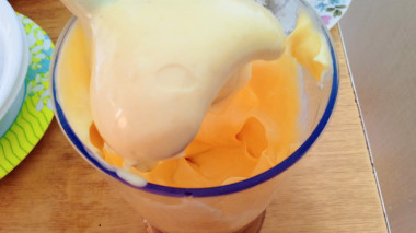 2. Далее взбивать миксером, постепенно, по чуть-чуть, добавляя 1 стакан масла.