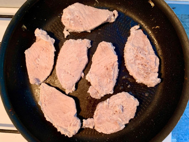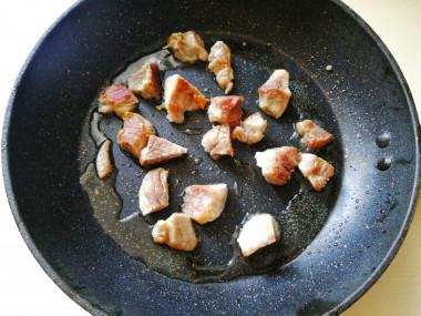 Затем мясо нужно достать и порезать кусочками средней величины. Разогреваю в сковороде масло и на сильном огне обжариваю кусочки мяса до образования аппетитной золотистой корочки. Выкладываю мясо вместе с маслом, в котором оно готовилось, в форму для запекания, предварительно застеленную фольгой.