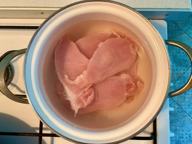 Сырую свинину кладу в кастрюлю, заливаю водой, добавляю соль и специи и варю в течение получаса. Также сделать это можно в мультиварке, выбрав подходящий режим.