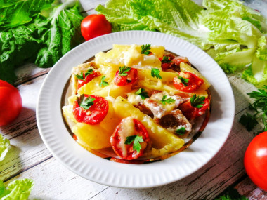 Сварившееся мясо остудила, нарезала на средние кусочки и обжарила до румяной корочки. Затем выложила в форму для запекания (у меня была большая сковорода), добавила к мясу картошку, помидоры, немного бульона (где-то полстакана) и поставила в духовку. Температуру сделала 220°.