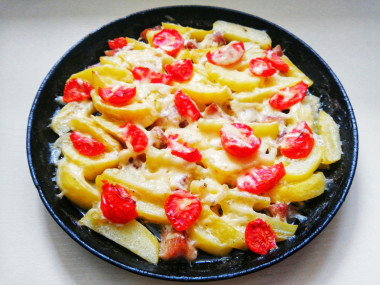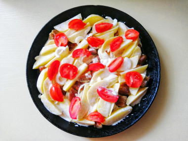 Режу помидор – сначала на четвертинки, потом каждую четвертинку еще на две части. Кладу кусочки помидора в форму для запекания. Сверху все заливаю стаканом бульона, оставшегося от варки мяса, и отправляю будущую царскую картошку печься в духовку. Длительность приготовления при 200 градусах – примерно час, но, если вы готовите впервые, время от времени проверяйте блюдо на готовность, особенно, если картофель молодой.