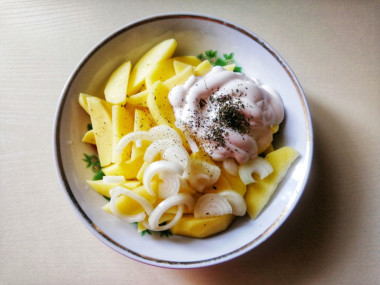 Пока мясо стояло на огне, нарезала картошку и лук, добавила к ним майонез, соль и сушёный базилик, перемешала.
