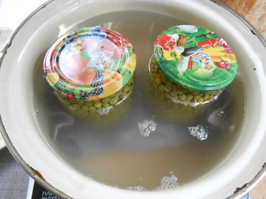 Горох разложите по заранее простерилизованным банкам. Оставьте зазор в пару сантиметров до горлышка. Кипящим маринадом залейте банки до плечиков, накройте их крышками. Стерилизуйте в кастрюле с водой (она должна доходить до плечиков банок) в течение 10 минут. На дно кастрюли положите тряпочку, чтобы стекло не лопнуло. Время стерилизации заготовки зависит от объёма банки. Подробнее о стерилизации банок, крышек и заготовок читайте в статьях под шагами.
