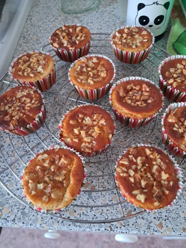 Решила попробовать рецепт и слегка его модернизировать:) Добавила грецкий орех (измельченный руками сверху перед выпечкой), а вместо маргарина решила использовать оливковое масло,получилось очень интересно,очень воздушные и нежные кексики!
